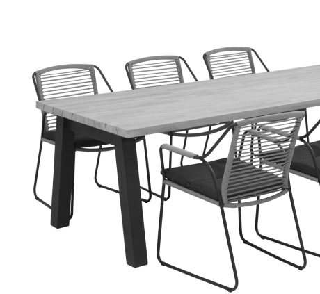 Мебель для открытых пространств из тикового дерева, HPL, металла и текстиля, с применением веревочного плетения.