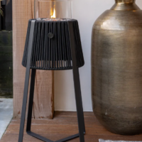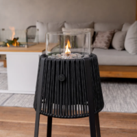 Изящная, высокая, выполнена на черном алюминиевом основании, верхняя часть в веревочном плетении из всепогодного шнура в черном цвете. Магия огня и стиля, эта горелка безусловный хит сезона!