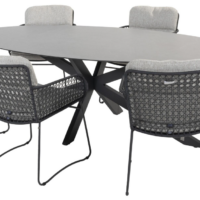 Обеденный стул APRILLA в цвете антрацит — новинка 2025 года, выполнен на изящном, но прочном основании из алюминия в тон столу, воздушное плетение из круглого тонкого искусственного ротанга выполнено вручную лучшими мастерами фабрики с многолетним опытом! Контрастные подушечки на спинку и сиденье в светло-сером цвете из олефиновой ткани, всепогодный наполнитель ! Округлые подлокотники, высокая спинка, продуманная эргономика — модель удобная и комфортная !