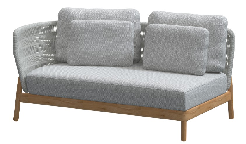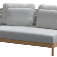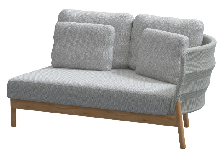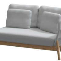 — Угловой модульный диван холодного светло-серого цвета с изящным основанием из натурального тикового дерева.