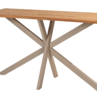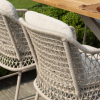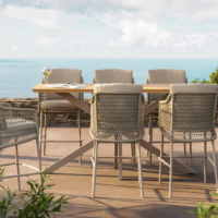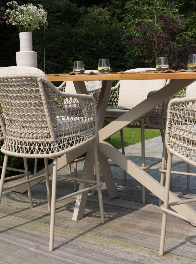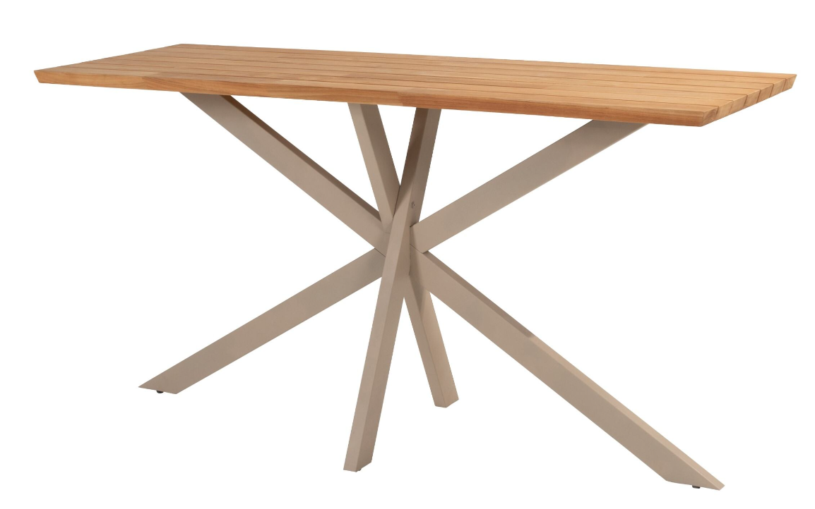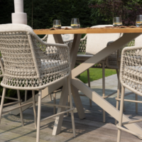 Стол Prado выполнен на изящном алюминиевом основании в цвете Latte, столешница из натурального тикового дерева самого высокого класса А.