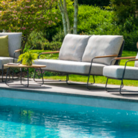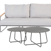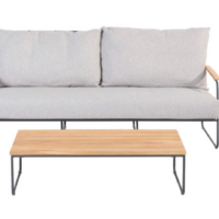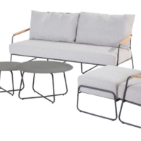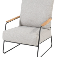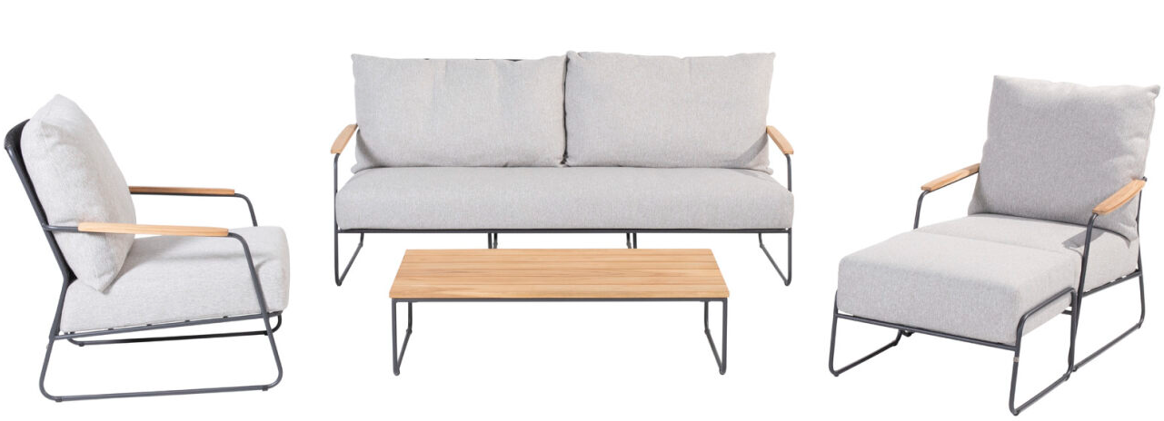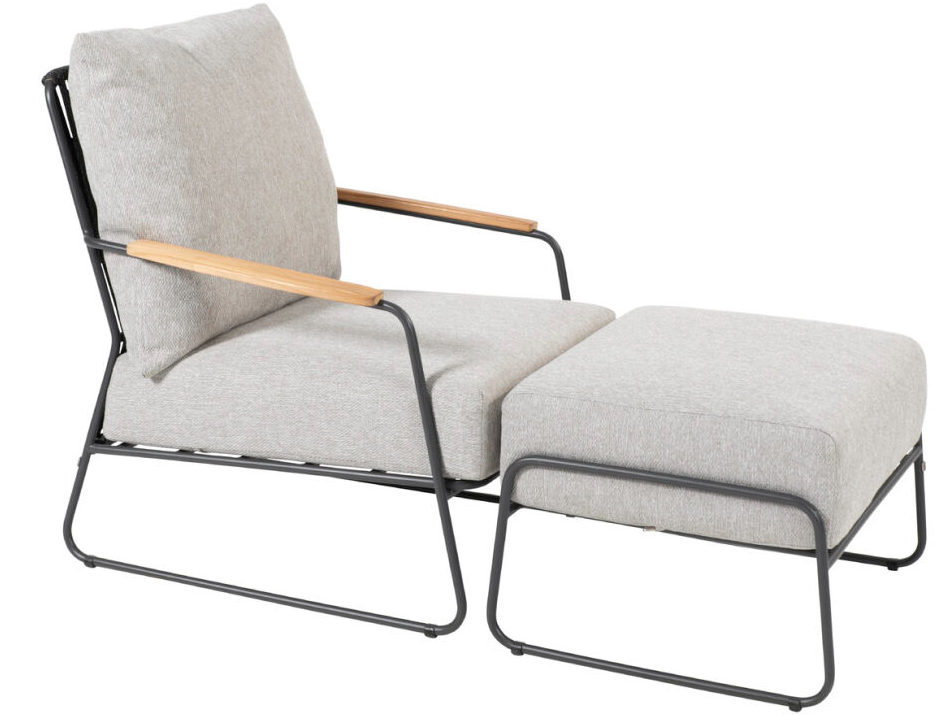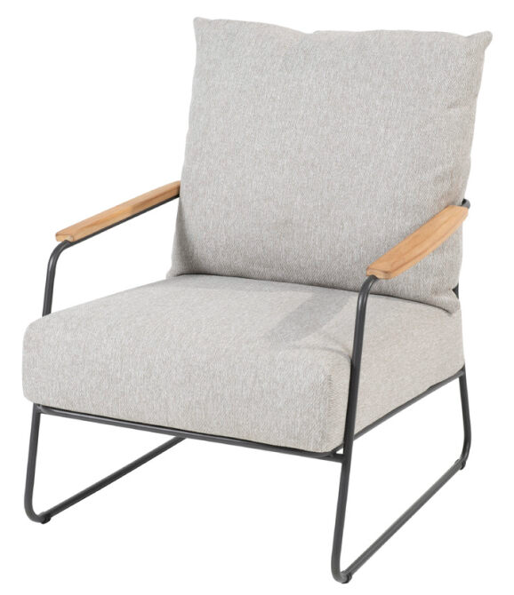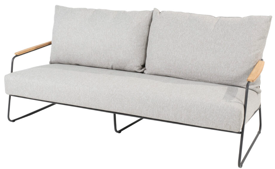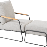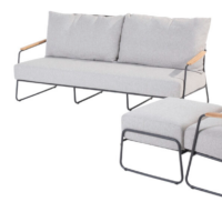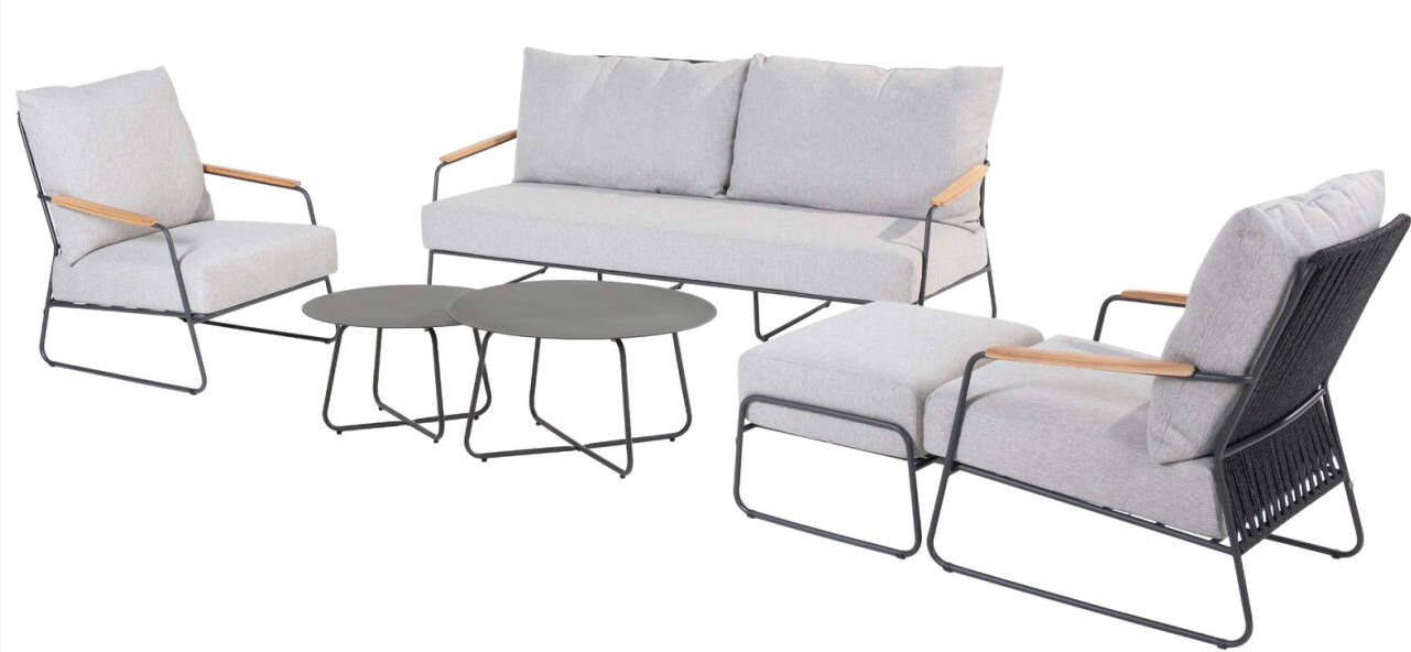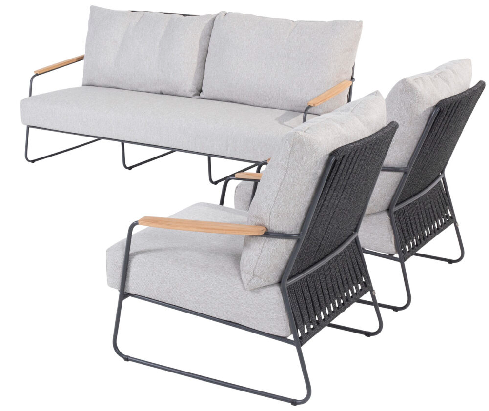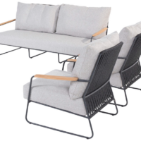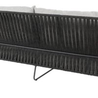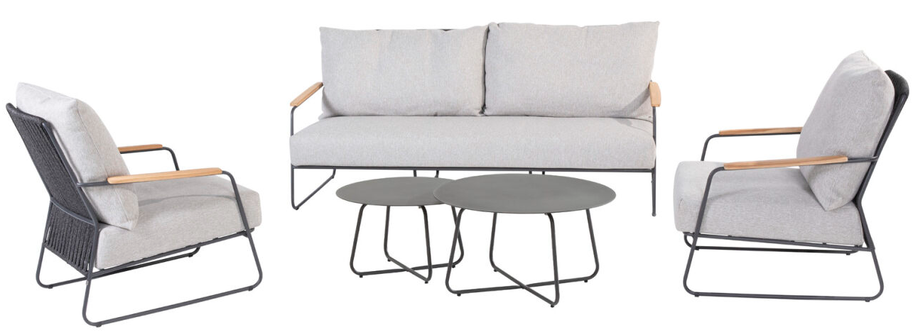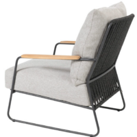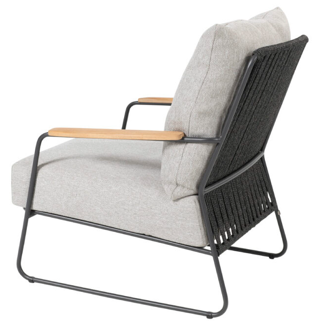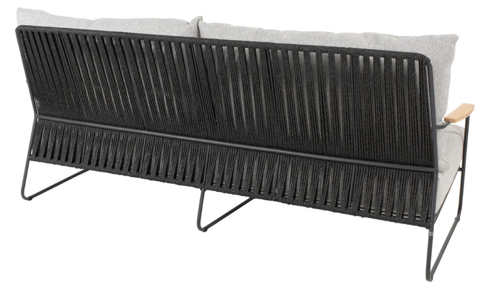 Прочное стальное основание в цвете антрацит, объемные удобные подушки светло-серого цвета, отделка подлокотников натуральным тиковым деревом, спинка в веревочном плетении из черного всепогодного шнура, всепогодный текстиль и наполнитель подушек. Все материалы устойчивы к атмосферным воздействиям, тактильно приятные и простые в уходе.