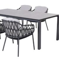 Благодаря стилю, долговечности, устойчивости к атмосферным воздействиям современных материалов и веревки, текстиля и наполнителя, обеденный комплект идеально подходит для использования на открытых пространствах и применения в интерьерных решениях!