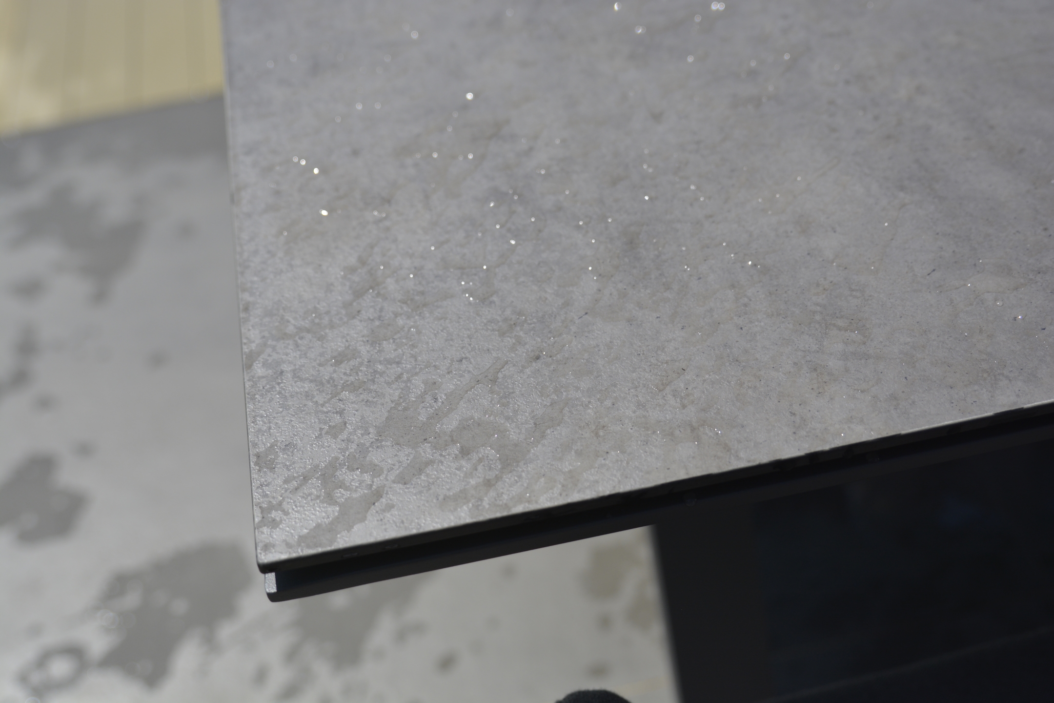 Обеденный стол для улицы GОА, стильный и минималистичный. Стол выполнен на алюминиевом основании в цвете антрацит со столешницей из материала HPL (High Pressure Laminate) в темно-сером цвете.