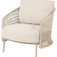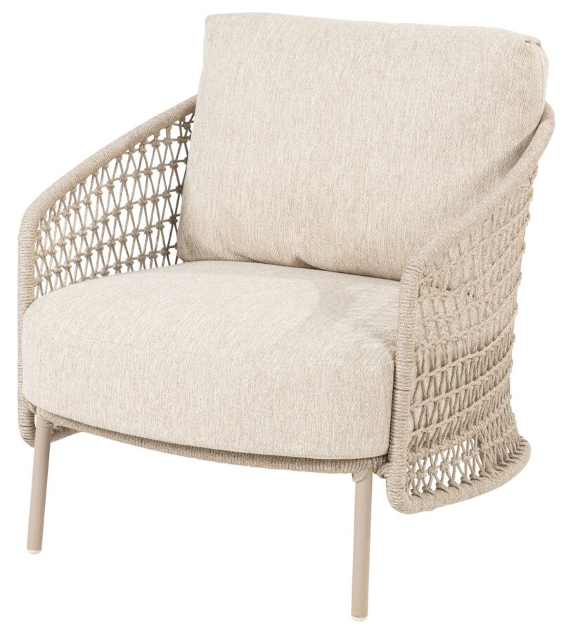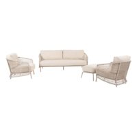 Основание этой мебели выполнено из легкого и долговечного алюминия, плетение из всепогодного шнура Rope в светло — бежевом цвете. Законченный внешний вид придает необычное узорное плетение и текстиль подушек в тон волокну, плавные изгибы подлокотников и столик из натурального тикового дерева. Плетение всегда выполняется только вручную мастерами фабрики с многолетним опытом!
