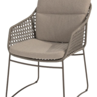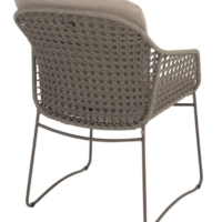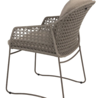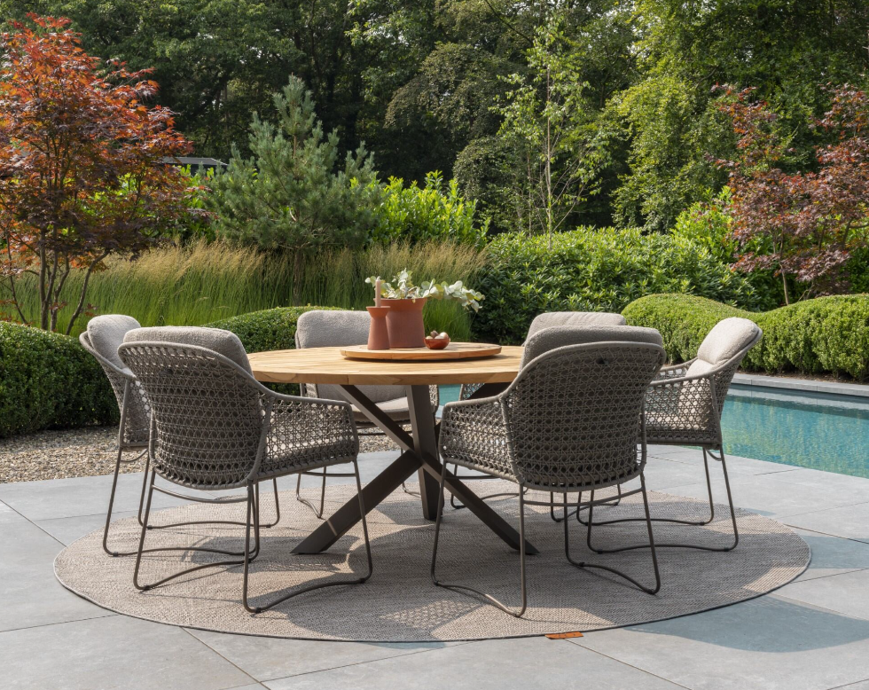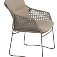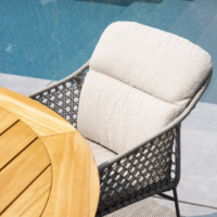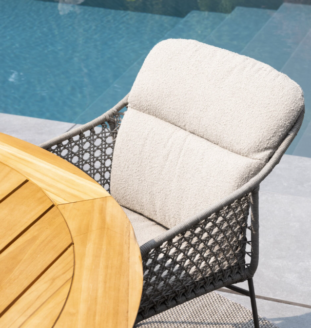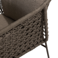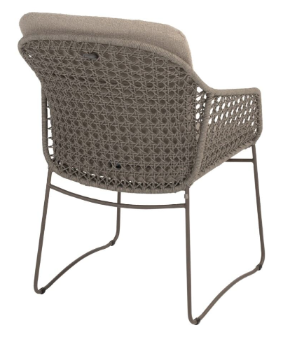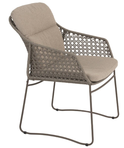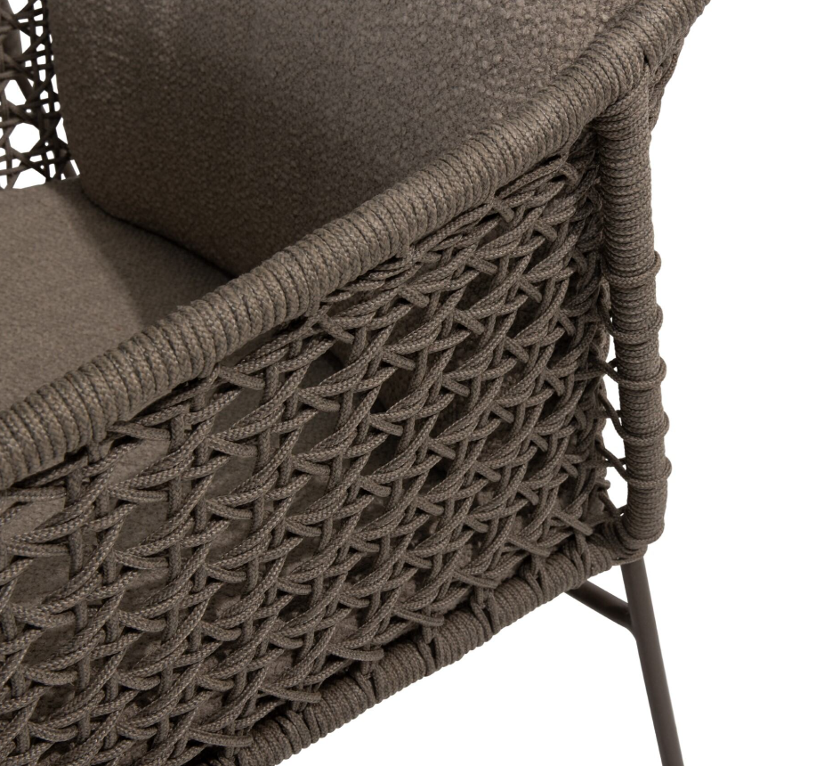 Прочное, но изящное основание стульев выполнено из стали в новом цвете Terre, сиденье оплетено красивым узором круглым всепогодным шнуром, две подушки в тон плетению и основанию!