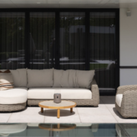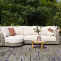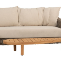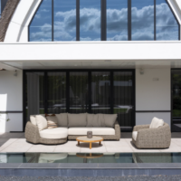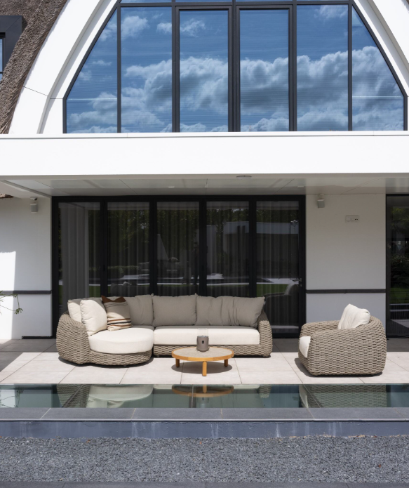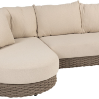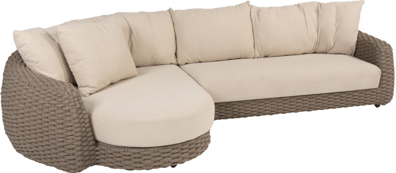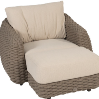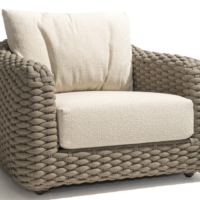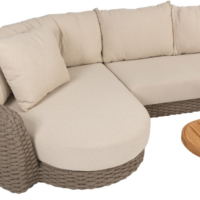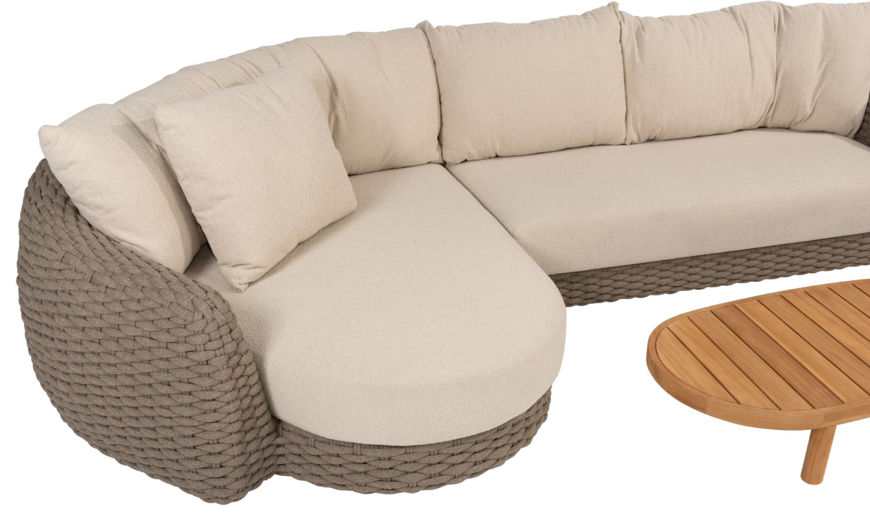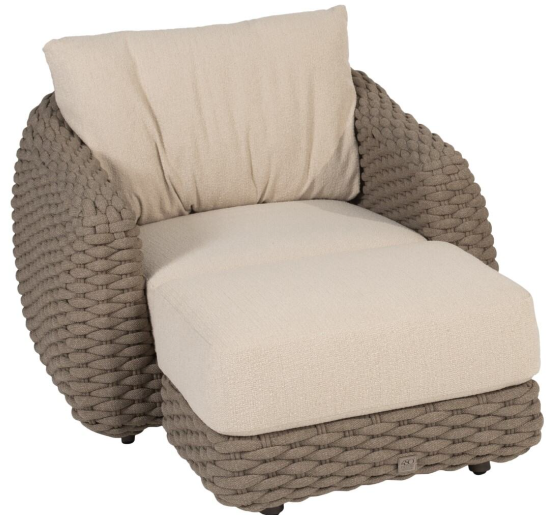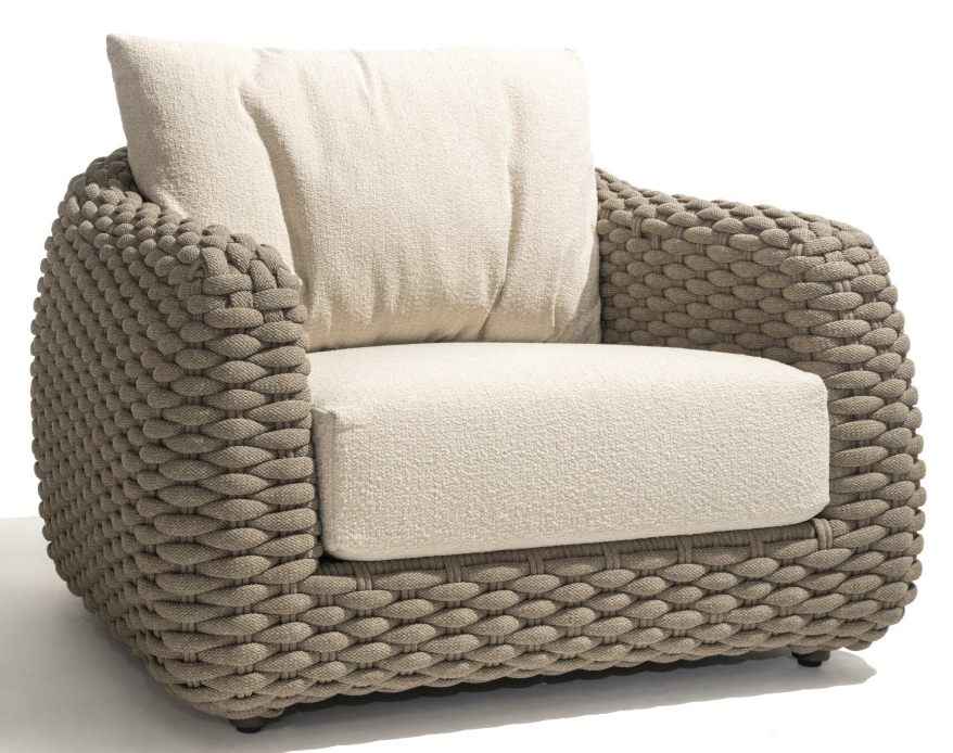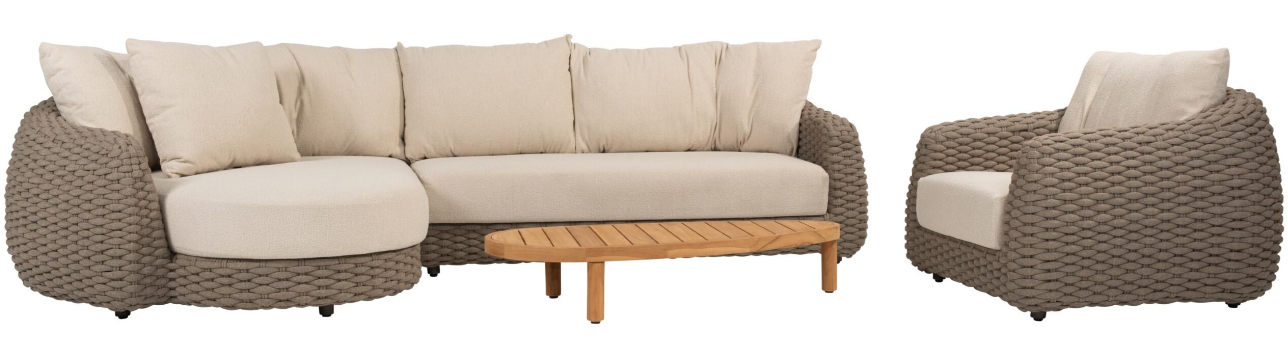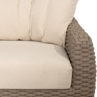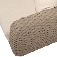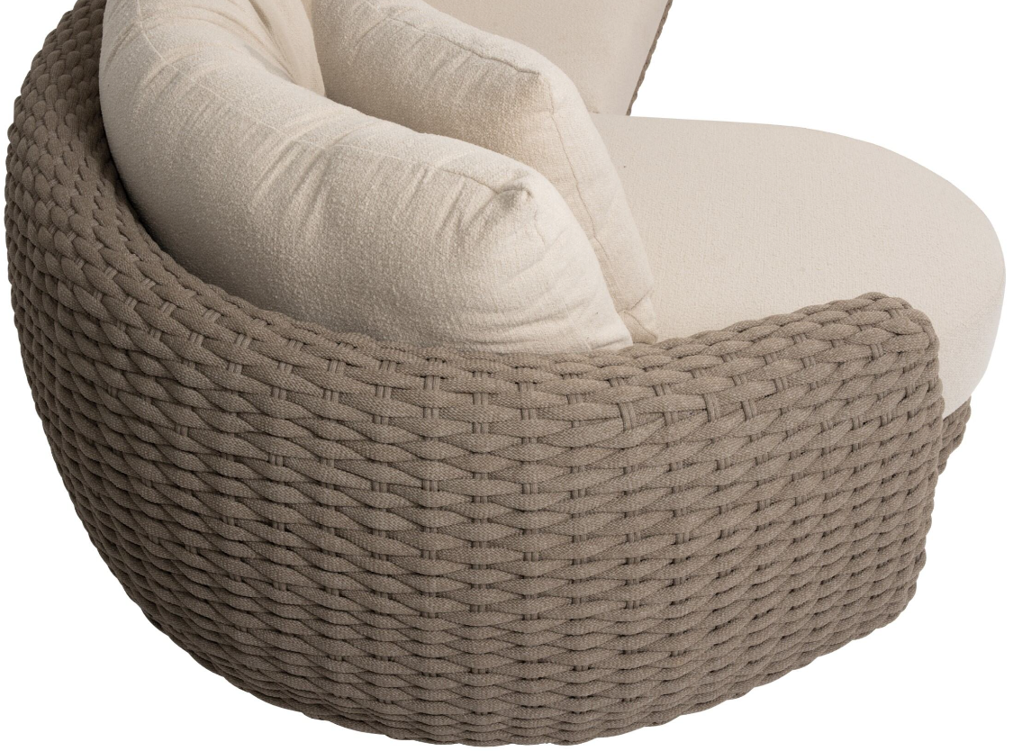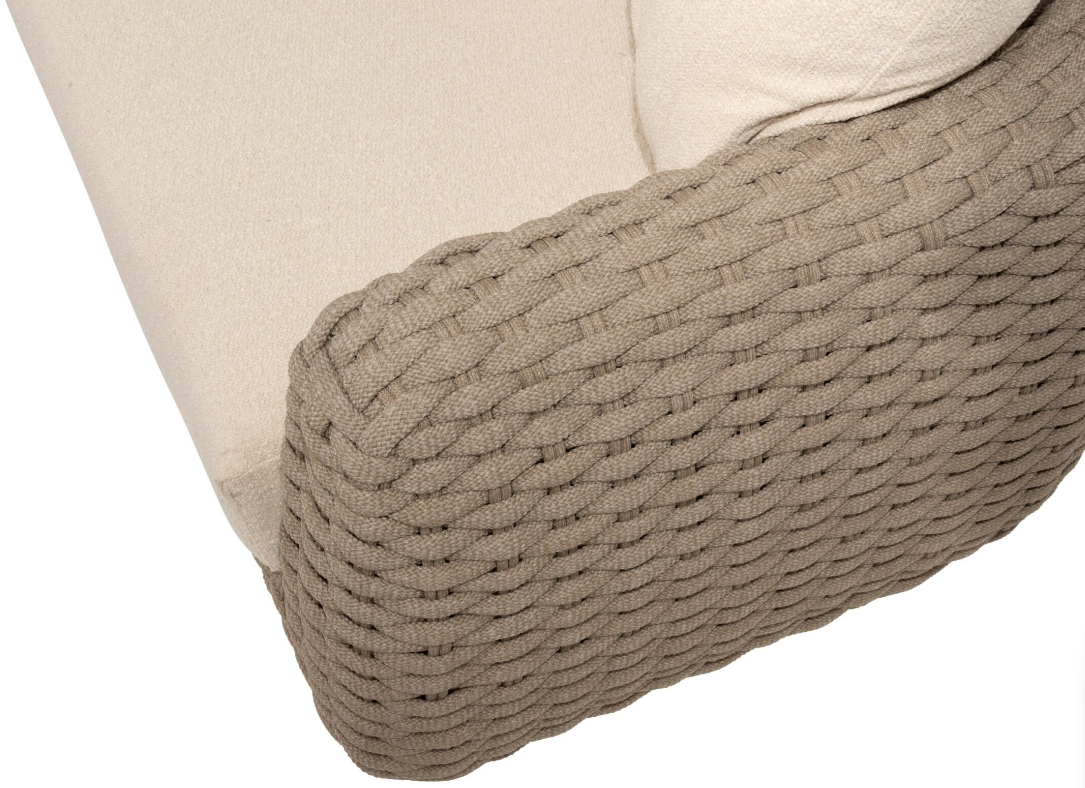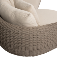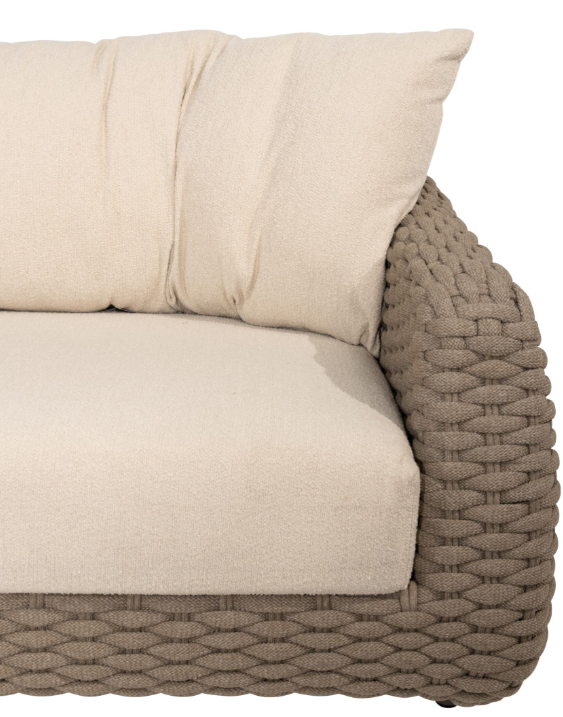 Внешний вид очень современный и не оставит Вас равнодушным: объемные округлые формы, фактурность плетения из всепогодного каната, приятная тактильность ткани подушек, пастельные теплые тона!