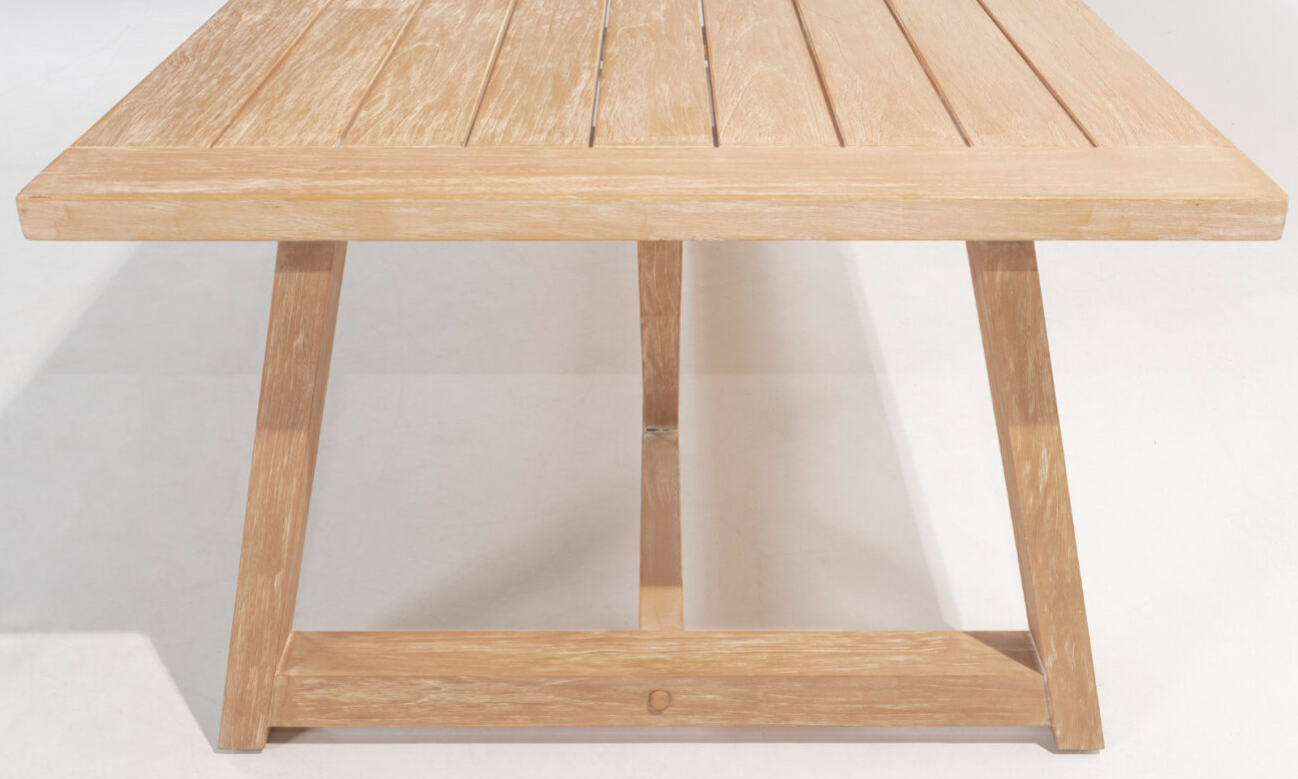 Новое направление в уличной мебели — технология браширования тика, его искусственное старениею. При этом лишь подчеркивается текстура, тепло и природная красота. Брутальный, большой, стильный, этот неповторимый стол позволит с комфортом разместить 8 персон!