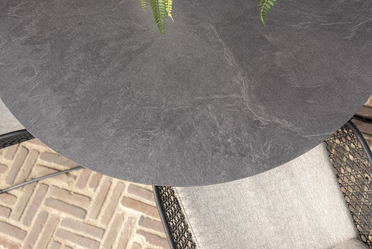 Стильный обеденный стул APRILLA в цвете антрацит, новинка 2025 года, выполнен на изящном, но прочном основании из алюминия в тон столу, воздушное плетение из круглого тонкого искусственного ротанга выполнено вручную лучшими мастерами фабрики с многолетним опытом! Контрастные подушечки на спинку и сиденье в светло-сером цвете из олефиновой ткани, всепогодный наполнитель ! Округлые подлокотники, высокая спинка, продуманная эргономика — модель удобная и комфортная !