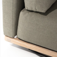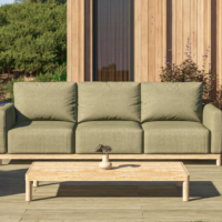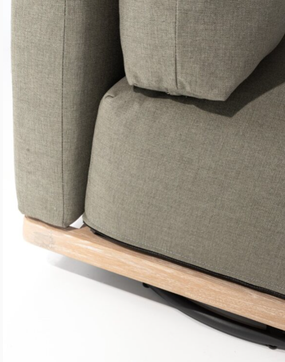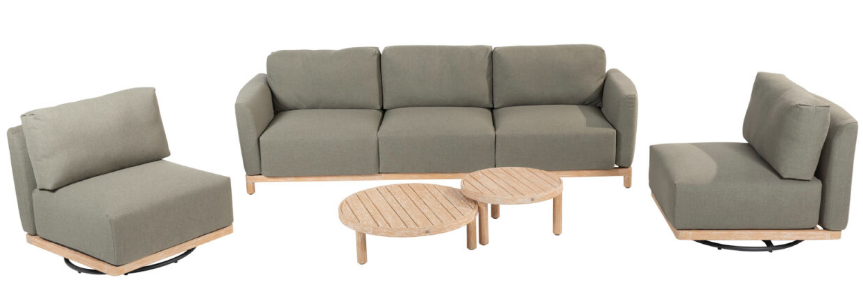 Основание дивана и кресел выполнено из алюминия, отделка нижней части мебели и столик из брашированного (искусственно состаренного) тикового дерева. В кресла встроен поворотный механизм, благодаря чему они могут вращаться вокруг своей оси. Съемные чехлы подушек из олефиновой ткани в ультрасовременном цвете Olive, внутри всепогодный наполнитель из крупнопористого вспененного волокна, он не задерживает влагу, хорошо проветривается и не плесневеет!