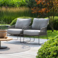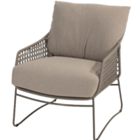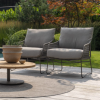 Прочное, но изящное основание из стали в цвете Latte, сиденье оплетено красивым узором круглым всепогодным шнуром, две подушки в тон плетению и основанию!