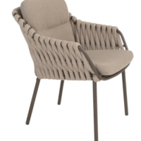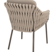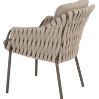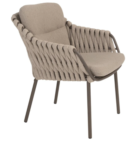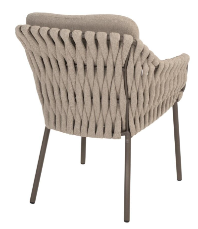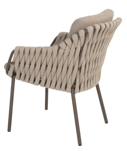 Основание обеденного стула MONTERA выполнено из алюминия в новом модном цвете Terre, в тон столу, чаша сиденья оплетена вручную круглым широким всепогодным шнуром в цвете Latte, две буклированные подушки для максимально удобной посадки!