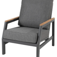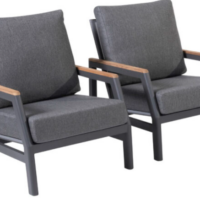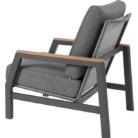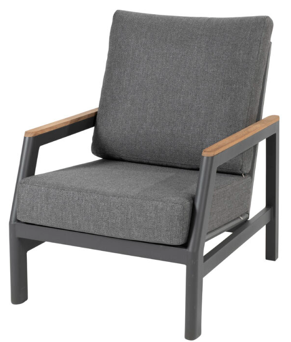 Основание комплекта выполнено из алюминия в цвете антрацит, всепогодные текстиль и наполнитель подушек, накладки на подлокотники из натурального тикового дерева !