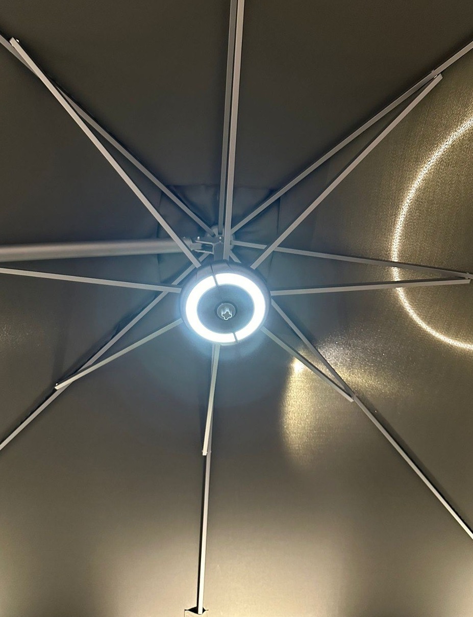 Стемнело и нет желания уходить с террасы ? Хочется, чтобы общение в кругу друзей продолжалось? Фирменная подсветка подкупольного пространства — лучшее решение, расширяющее функционал Вашего зонта !