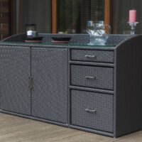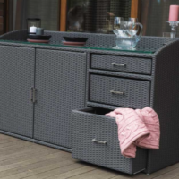 Уличный комод от Швейцарской фабрики создан мастерами с многолетним опытом вручную из качественного волокна Rehau (Австрия). Устойчив к атмосферным осадкам, ультрафиолетовым лучам, не требует особого ухода. В верхней части комода толстое каленое стекло для защиты плетения от пыли и порезов, имеется три выдвижных ящика и отсек с распашной дверцей, за которой пространство с полочкой.