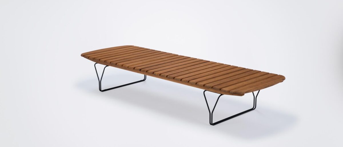 Поверхность и мягкие закругленные бамбуковые ламели в сочетании с металлической конструкцией наводят на мысли о пирсе и непринужденной атмосфере у моря.