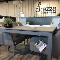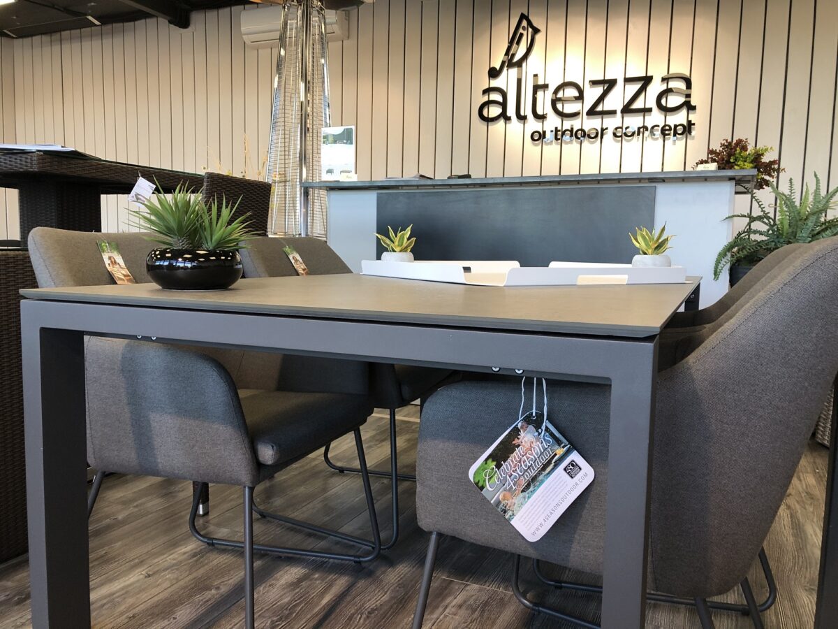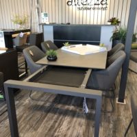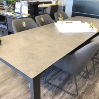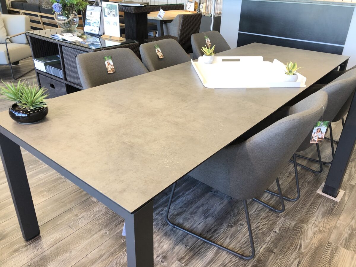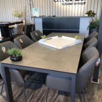 Обеденный стол для улицы Goa, стильный и практичный, выполнен на алюминиевом основании в цвете антрацит со столешницей из материала HPL (High Press Laminate) в сером цвете.