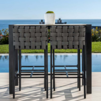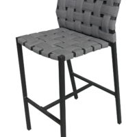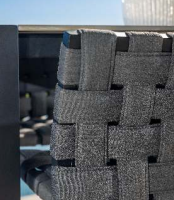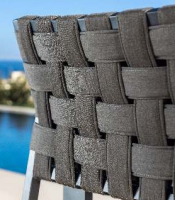 Основание выполнено из квадратной алюминиевой трубы, окрашенной специальным составом, спинка и сиденье в плетении темно-серого цвета из плоской широкой двойной тесьмы Sunbrella (Испания). Удобная и комфортная посадка за счет высокой спинки и подставок для ног в нижней части!