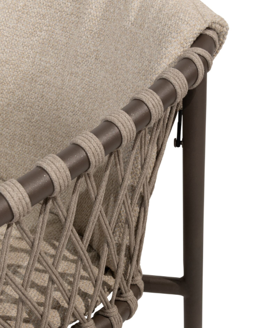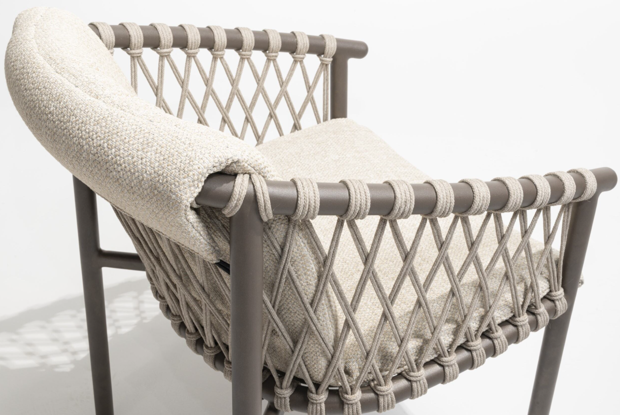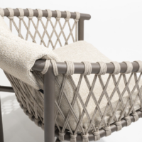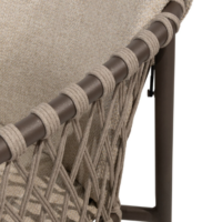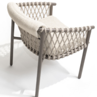 Выполнен на алюминиевом основании с порошковым покрытием, чаша сиденья оплетена вручную всепогодным шнуром серого цвета, две подушки для большего комфорта!