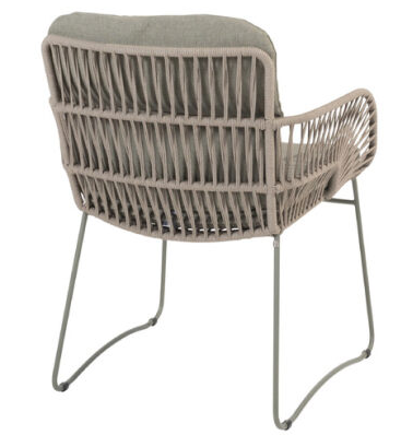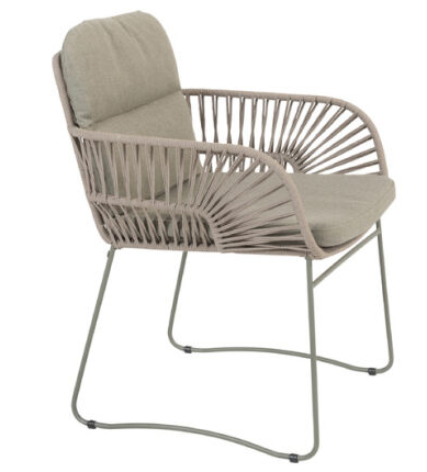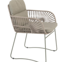 Прочное, но изящное основание из алюминия и подушки выполнены в оливковом цвете, плетение из круглого всепогодного шнура в светло-бежевом цвете. Округлые подлокотники, высокая спинка, две подушки — модель очень удобная и комфортная. Оригинальный рисунок плетения, как будто лучи солнца на восходе, делает эти стулья поистине неповторимыми!