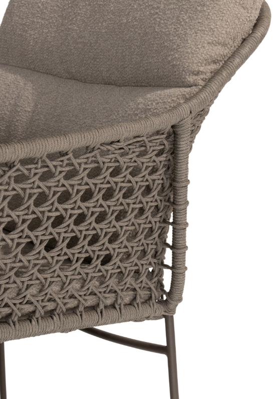Прочное, но изящное основание из стали в цвете Terre, сиденье оплетено красивым узором круглым всепогодным шнуром, две подушки в тон плетению и основанию! Приятное сочетание пастельных тонов и фактурности ткани, невероятно удобная посадка, широкое сиденье, высокая спинка и подлокотники, каждая деталь на своем месте. Кроме всего этого, стул максимально прост в уходе и идеально сочетается с большинством обеденных столов из нашего ассортимента!